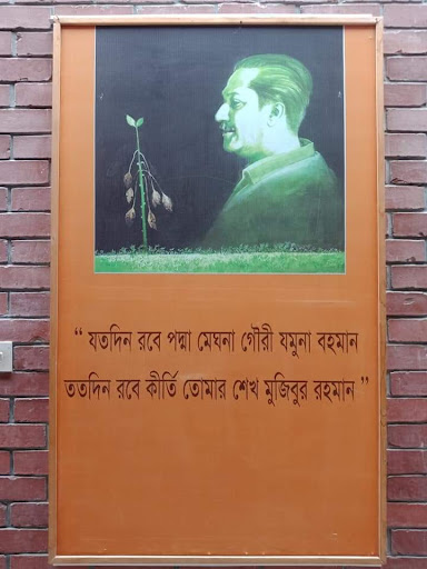 The poem- “Jotokal robe Padma, Meghna, Jamuna, Gauri bohoman, totokal robe kirti tomar Sheikh Mujibur Rahman,” which roughly translates to, “As long as the rivers Padma, Meghna, Jamuna and Gauri continue to flow, the legend of Sheikh Mujibur Rahman will remain alive in the hearts of the people.”