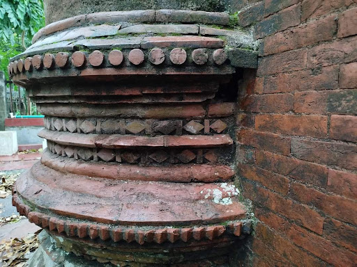The Chuna Khola Mosque, built in the 15th century, is located in the midst of rice fields in the village of Chuna Khola (named after the limestone extraction that was in vogue here in the past). It has been identified as representing a transition from the Khan Jehan style monuments. It is a 7.7 metres (25 ft) square building with 2.24 metres (7 ft 4 in) thick walls.It has three entrances on the east and one each on the northern and southern sides also. It has three mihrabs with the central mihrab being the largest in size and projecting outwards. It has a hemispherical dome with frontal arches. There are also squinchesand half domes. It is distinctly different from the Khan Jehan style mosque in its exterior decorations, particularly the east façade, which depicts four rectangular panels bordered by foliated scrolls with merlons having plant motifs. It has four turrets with curved cornices. The brick walls, in particular, were damaged due to sulphate effect. It was renovated in the 1980s according to guidelines...