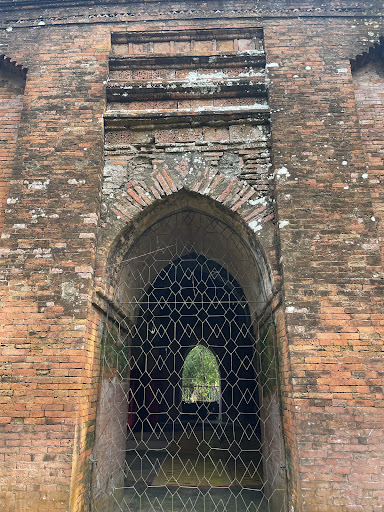 The Nine Dome Mosque is a historic mosque in Bagerhat, Bangladesh. It was built in the fifteenth century by a Mughal general on orders from Babur himself and supervised later on by Humayun.[1] The Nine Dome Mosque is located to the west of the takur dighi tank and built in the 15th century, it is close to Khan Jahan Ali's Tomb. Its western wall conventionally faces west towards Mecca, where the mihrab is inset on the western wall; terra cotta floral scrolls and flower motifs are the decorations seen around the mihrab. Circular towers are provided in the four corners. The walls of the mosque support a large central dome which has eight smaller domes around it. This structure was also affected by sulphates. It has been since substantially restored. Close to this mosque are the Zinda Pir Mosque and mazar (tomb), which are in ruins.