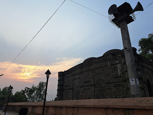 The central mihrab is projected in the west. The interior west (qibla) wall has two mihrabs on the floor level opposite the central and southeastern entrances, but the one in the northwestern bay is above a raised platform ascended by a staircase on the east. The presence of such a platform in a non-imperial mosque indicates that not only royalty, but nobility and high-ranking officials were also separated from the general public during prayers. The mihrabs have elaborate stone carving. They have cusped arches crowned with kalasa (water pot) motifs, supported on intricately carved stone pillars which have projections and tasseled decorations hanging from chains. Bunches of grapes and vines curve in an almost serpentine manner on the mihrab frames, and kalasas, tendrils and rosettes are reduced to dots.