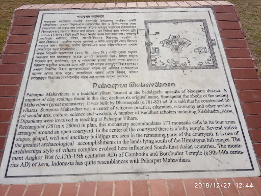 Read morePaharpur Buddhist Vihara or Sompur Vihar or Sompur Mahavihar is an ancient Buddhist Vihara which is now destroyed. Sri Dharmapala Deva (781-821), the second king of the Palavansh dynasty, was building this vihara in the late 8th or 9th century. Sir Alexander Cunningham discovered this huge structure in 1879 AD. Paharpur Vihara or Sompur Buddhist Vihara is the second largest Buddhist Vihara in Southern Himalayas according to UNESCO. In size it can be compared to the Nalanda Mahavihara in India. It was the most famous Buddhist teaching center for 300 years. Not only from different parts of the subcontinent, but Buddhists from countries like China, Tibet, Myanmar (now Brahmadesh), Malaysia, Indonesia etc. used to come here to acquire religious knowledge. Acharya of Bihar in 10th century AD was Atish Dipankar Srijnana. UNESCO recognized it as a World Heritage Site in 1985.