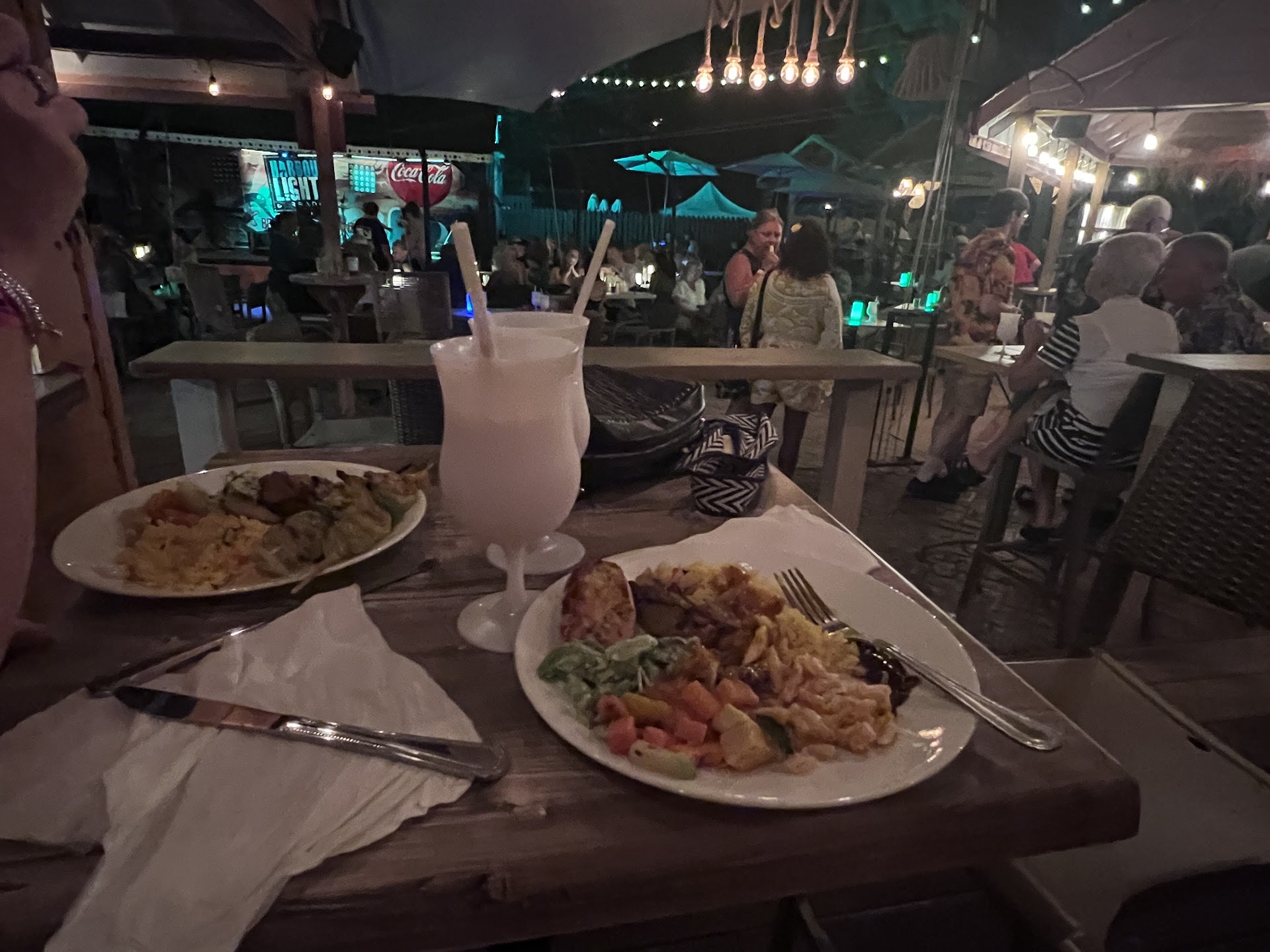 Food, I’m vegetarian so I wasn’t expecting the world. On arrival guest were offered an Amuse-bouche of battered fish cakes and deep fried plantain. Both served to your plate with the same piscus covered utensil. I passed. The main. On entry to the event you’re given four choices. Steak, Shrimp, chicken or the very lazy, let’s choose to cook this heavily processed veggy/vegan, I don’t want this muck, straight from the freezer. I showed my little green dietary ticket to the server who instinctively reached for the food tongs off the BBQ. NO!!! The vegan burger was prepared away from everything else, but you failed at the last hurdle. I don’t want meat or fish juices mixed into my meal. To be fair the side dishes had a varied choice Rice, potatoes salad and beans. But I was given a sliver of the macaroni pie, a folk full. The steak/ chicken eating couple sat near the stage had paid exactly the same but had received a far better service.