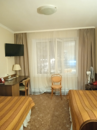 I liked Sputnik.||Many thousands Russian tourists like Sputnik, too – book in advance and check Russian national holidays, it is full-booked in May, June and January.||||The room is nice, quite enough space for one person and one suitcase. The bathroom is spotless, and the fixtures look – maybe they are just very well maintained.||The furniture looks new, too, although it is not – I’ve seen it on VT member HORSCHECK’s page, but quality stuff keeps good look for years. The chairs and, what’s more important, the bed are very comfortable (the matrass is of a higher standard, than the one in the hotel Beltransgaz). By the way, I’ll find out if the furniture is home-made, Belarus is well-known for its furniture, they should make their hotels a showcase for their products. For example, hotel Minsk, more central and expensive, has the same furniture, only in ruby shade.||The TV set ‘Horizont’ is definitely made in Minsk, it shows about 30 channels – two English-language, Arabic, Spanish and German (I noted there was no French). Then there are three Belarusian channels, one showing vintage Soviet films – I enjoyed a 1950s’ musical, they had good voices at that time.||||This makes me recall the plasma TV in the breakfast room with its intrusive pop songs, nearly drove me mad. Otherwise everything is OK; I mean, for hearty eaters it’s absolutely great – they have five sorts of meatballs for breakfast! For my part I would prefer them to spend the fund on cheese and bread, but I know my compatriots are positively in raptures about Sputnik’s buffet breakfast.||If you like vintage design, you will note the chairs – indeed they rather suit a 19th century boutique hotel.||||Speaking about times, Sputnik was built in 1963, and the outward design is rather modest. But guess what I like most about this place – the walls! They are no less than 50 – 70 cm thick; the temperature in the street went below zero when I was there, but it was very comfortably warm inside. No wonder they hardly need any health-threatening air-conditions in summer.||No noise either: trust me, I normally hear an alarm-clock in the neighbouring room, and my windows went out into the street – all quiet at night. There is a lovely little park in front of the hotel.||||So far I am quite happy with their service; I have asked numerous practical questions about the city, and they answer within an hour. Wi-Fi available and free, but a bit uneven.||||The location is not exactly central, but then their tariffs are affordable.||The distance from the railway station is 1.5 km on the map, it's about 15 minutes on foot, but with the luggage you won't like it; better take bus or trolley-bus, just two stops.||||P.S.||I've seen an ad on their site - they have vacant rooms during Ice Hockey Championship this May.||Looks like they could do with more guests, I'll see if I can figure out a sensible itinerary for budget groups to keep them busy.||||Unique Qualities: Functioning Internet site in Russian / English / German||||Two other important points – refrigerator in the room and cold/hot water dispenser on the floor; you can easily make your own tea/coffee, or even quick lunch with instant soup (I did exactly that).||||A bank and ATM around the corner – workable, I used it.||||Two budget ‘Dor-Ors’ shops (I’ll tell you about this brand in another tip) – food supermarket and haberdashery, where you can buy ladies’ cotton socks for $ 1.5, sun hat or soap. Oh no, soap is one thing you won’t need, they give you a full supply of toiletries in Sputnik – soap, shower gel, shampoo, toothbrush & toothpaste, hair brush and even nail file, and a new package...