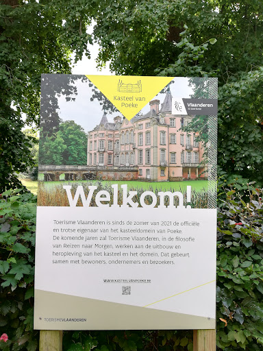Het kasteeldomein van Poeke is gelegen in een bosrijk park met een ronduit schitterend kasteel in een speciale bouwstijl met lichtroze gevels.