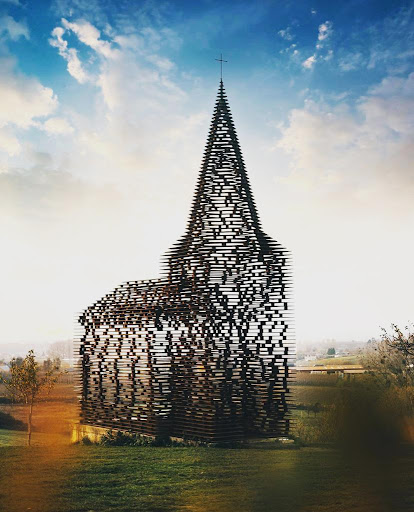 It is based on the design of the local church. This ‘church’ consists of 30 tons of steel and 2000 columns, and is built on a fundament of armed concrete. Through the use of horizontal plates, the concept of the traditional church is transformed into a transparent object of art.