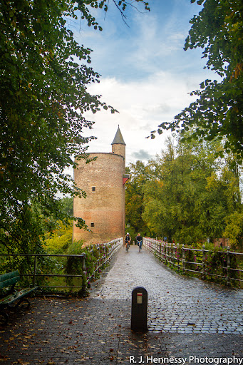 As you crossing the Bargeburg and enter the south side of the city center turn left and walk through the lush woods. As the tree part you are greeted by the Poertoren(Gunpowder Tower) and the crossing of the Minnewaterbrug (Lover's Bridge). This bridge and tower transport you into the southside of the Central City. Don't miss the stairway down to the canal next to the tower. It takes you to a secluded park...