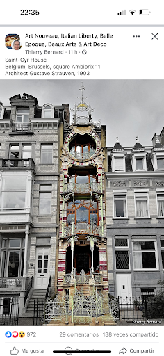 Read more“Maison de Saint Cyr” The Saint Cyr house was designed by Gustave Strauven from Brussels, a pupil of Victor Horta with whom he completed the Eetvelde and Peuple houses. Strauven was only 21 years old and his father, Pierre Arnold Strauven, was a gardener. The young architect was very interested in the use of new technologies and collaborated in the magazine "La Gerge", of Art Nouveau decoration and architecture. The house is on the Ambiorix square in Brussels and was built between 1901 and 1903 as the home of the painter Georges de Saint Cyr. Its asymmetrical facade is only 4 meters wide and is also divided into 4 floors in height. It has an ornamentation in glass and wrought iron that is a fantasy, with unique details. Perhaps it was inspired by the gardens that his father tended and he would see as a child. Throughout the twentieth century it was considered excessive and extravagant and was even despised by some critics of Art Nouveau. To me it seems to be a masterpiece full of the strength, audacity and freedom of youth, talent and everything that surrounds that first flight after leaving the nest and starting...