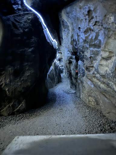 Vervolgens komen we op een ondergronds kruispunt waar we worden voorzien van een “klank- en lichtspektakel” de gids verwittigt ons nog even voor de “saaie” muziek en dat zij deze niet heeft gekozen. Daarenboven worden we verzocht om naar een donker “gat” te kijken.
