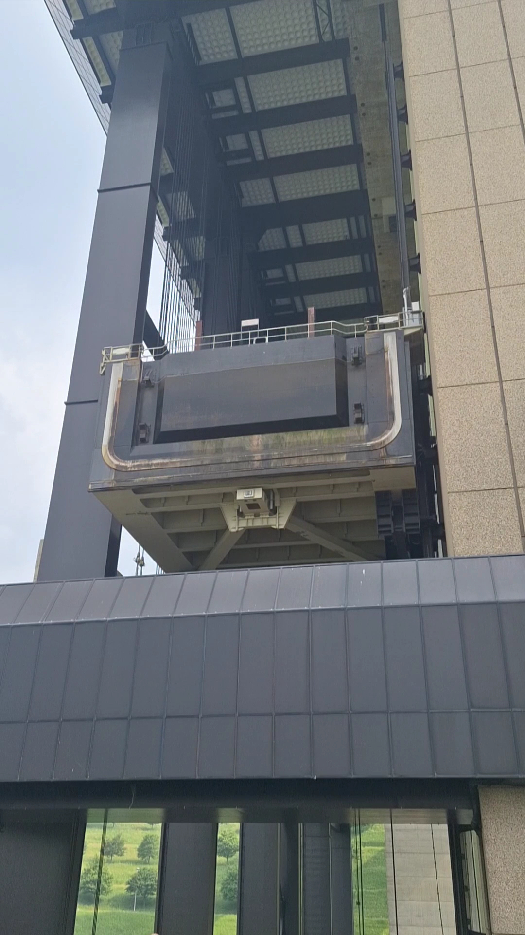 This boat lift is an example of magnificent engineering. It overcomes a height difference of 73m and until 2016, when the boat lift in the three georges dam in China took over, the tallest boat lift in the world. It was completed in 2002 together with the canal and aquaduct nearby. The lift has two counterweighted caissons (tanks) of 118m long, 16,5m wide, and 8 meter high. There are eight large counterweights connected via 144 steel cables to each tank. Four huge electric motors drive the vertical movement of each tank. You can visit the eight floor where you have a museum, a video presentation and where you can see the big machinery hall. On that level is also a cafetaria. On your way out, you can stop on level five for a panoramic look outside. When I was there (May 2025) there were no large ships lifted or lowered due to a collapsed bridge which blocked the canal north of the lift. Only small pleasure boats used the lift.