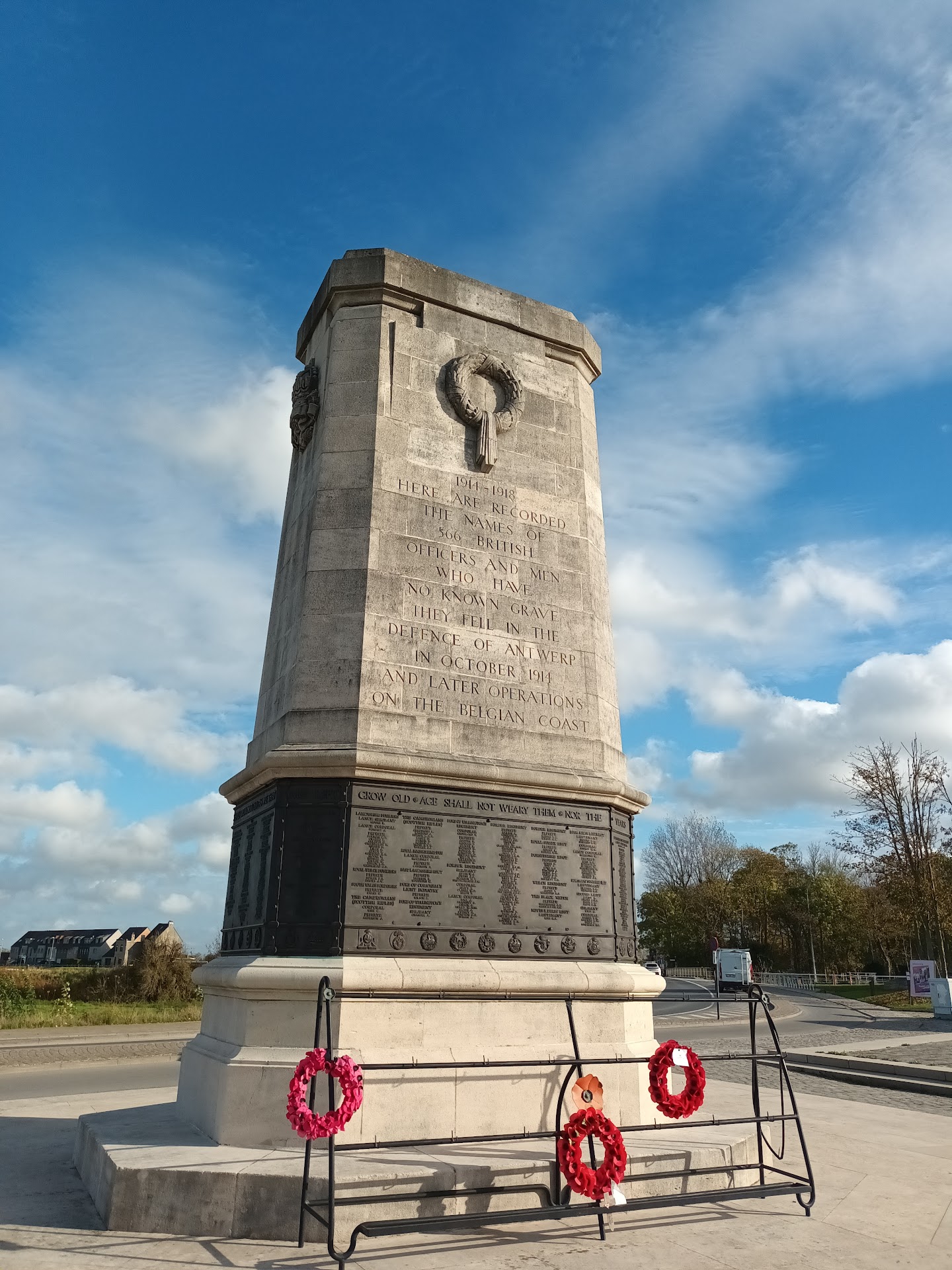 El British Nieuport Memorial es un monumento de la Primera Guerra Mundial, ubicado en la ciudad portuaria belga de Nieuwpoort (en francés: Nieuport), que se encuentra en la desembocadura del río Yser. El memorial enumera 547 nombres de oficiales y hombres británicos sin tumba conocidos que murieron en el Sitio de Amberes en 1914 o en la defensa de esta parte del Frente Occidental de junio a noviembre de 1917.El monumento es un pilón de piedra de Euville de 8 metros de altura, una piedra caliza de Euville. Los nombres de los conmemorados están fundidos en paneles de bronce que rodean la base del pilón. Tres leones, tallados por el escultor británico Charles Sargeant Jagger, montan guardia en las esquinas de la plataforma pavimentada triangular del monumento. Alrededor de la parte superior de los paneles con nombres de bronce se encuentran las palabras del famoso poema de Laurence Binyon, "For the Fallen": No envejecerán, como nosotros, los que quedamos, envejeceremos. La edad no los fatigará, ni los años los condenará. A la puesta del sol, y por la mañana, Los...
