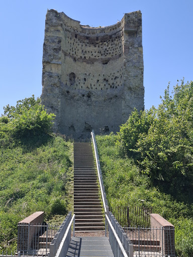 In de verdwenen helft bevond zich de ingang en de verholen trap die de bouwlagen verbond. De talrijke gaten in de binnenkant werden gekapt toen de burcht dienst deed als duiventoren.