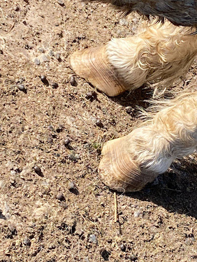 As horsey people, we were concerned about one pony, whose wire fence wasnât adequate because he kept begging for food and his front hoof repeatedly caught in the fence. This can cause serious injuries or his death because a horse, as a prey animal, is likely to panic when being stuck. Whatâs more, he suffers from a metabolic disease (cushing, see his coat in the photos), which causes a thick coat so he really should be clipped in summer in order not to suffer from the heat. His long hoofs could do with a trim too.