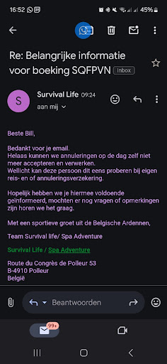 Read moreIk begreep de positieve reacties niet op de site van Survival Life, maar daar werd mijn review van ongeveer een A4-tje niet geplaatst! Haha, mooi is dat. Ik organiseer jaarlijks een sportweekend voor de klanten van m'n sportbedrijf en heb nog nooit zoveel ellende gehad bij het organiseren, met name in de voorbereidingen. Er zijn 34 mailtjes over en weer gegaan tussen mij en Survival Life. De cross country step kon niet doorgaan wegens wegwerkzaamheden, heb ik natuurlijk begrip voor, maar de alternatieven vond ik erg saai (boogschieten, wandelen). Zodoende vroeg ik of het mogelijk was te mountainbiken. Dit was mogelijk, mits er nog bijbetaald werd. Zo los je dat toch niet op, wiens probleem was dit nou..? Toen alles eindelijk geregeld leek te zijn, stond ik met m'n mensen klaar bij het mountainbiken. Op dat moment begon de instructrice met de vraag: "Wie is de hoofdboeker? Er is niet betaald".. Ik had drie maanden daarvoor het volledige bedrag in één keer overgemaakt en nog belangrijker, dit zeg je niet in het bijzijn van alle klanten. Ik kan nog een paar voorbeelden geven, maar neem van mij aan: er zijn voldoende aanbieders in de Ardennen die je ONTzorgen. De instructeurs hadden het kunnen goed maken, maar helaas straalden ook zij geen plezier uit.. Dat kwam volgens mij vooral door onzekerheid, het leken me stagiaires. De uitleg was dan ook regelmatig incompleet en dan wordt een leuke outdoor activiteit opeens onverantwoord. Al met al was ik dankbaar dat ik een fantastische groep klanten had, die overal een grap van maakten. Wat heb ik 'n pijn in mijn buik gehad en vaak op m'n lip gebeten zeg....