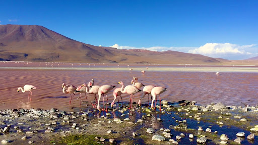 Read moreThe chilly, but oh so magnificent Altiplano is dotted with beautiful lakes, big and small. One of the most striking lakes is the Laguna Colorada (4,278m), a lake with orange to red water. This discoloration is caused by the sediment and pigmentation of algae, which are the food source of the Andes and James flamingos. Since 1990, Laguna Colorada has been the core of a "Ramsar Wetland of International Importance", a status indicating that this is an important wetland, particularly as a habitat for waterfowl. The foraging flamingos in the orange-red lake speckled with white borax islets and the peaks of the Andes in the background make this an unforgettable...