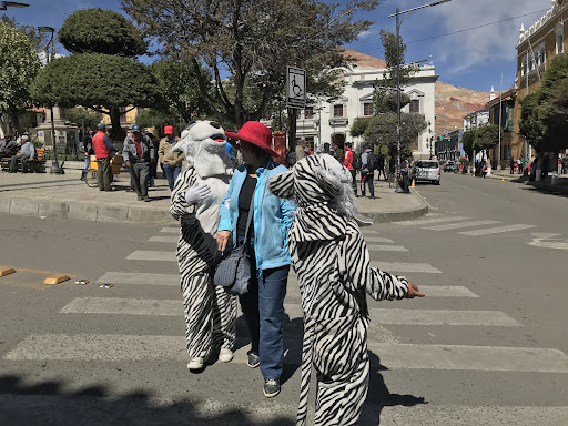 This really is the central hub of Potosi. We seem to gravitate to it during our few days as it is surrounded by the major cathedral, historic colonial buildings and lots of vendors. It is the city's main square and is referred to as "Plaza del Regocijo" because it hosts major celebrations like Carnival and national holidays twice a year since 1890. Historically, it was a venue for bullfights, where the Prefect would donate bulls for public entertainment. It has a great atmosphere and is quite beautiful at sunset. It also has some quite humorous wise of guiding pedestrians around with guides dressed in...