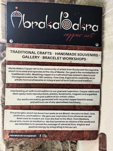 While exploring Tabhana in Mostar, we stopped by a copper workshop called Abrakabakra near the entrance, and it was such a memorable experience. The shop is filled with beautiful handmade pieces, each crafted with care and artistry. Prices are fair, especially considering the quality and detail of the work.