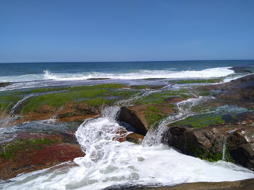 First beach on the reserve road... Access is across from the first turn off (small parking area on the right) you see.. about a 100 meter walk to where tha cliff starts down... Fairly steep and no direct path , but you make your way down the rock face to the bottom... When the water is low there is a large pool sized are where the water is 3-5 ft deep and warmed by the sun .. Small spaces on the rock face to put your bags .