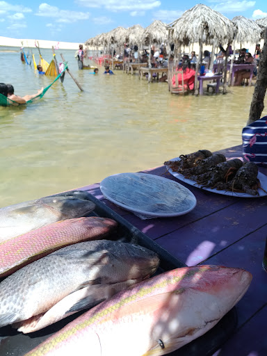 Uma Lagoa de água doce com redes na água e restaurante para você se relaxar em quanto experimenta os deliciosos peixes e frutos do mar da região, é o famoso cardápio vivo.