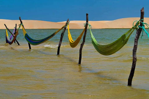 Por aqui você também encontra redinhas dento da água doce e sempre morna, para descansar, tirar boas fotos e aproveitar o sol sempre presente.