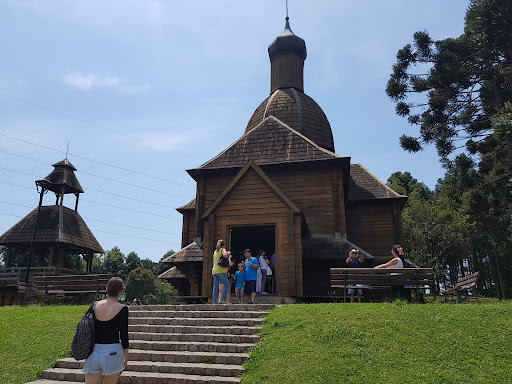 This place is absolutely fantastic! The church is a replica of one in the countryside built by Ukrainian immigrants to Brazil way back when. The building has a very interesting outside detail. Around the entire building, there is a skirt of roofing over benches built into the side walls. I can only imagine what was going on in the mind of the person who included this detail in the original design of the building. It is such a friendly thing to include. I can see people sitting outside safe from the rain and sheltered from the wind, talking and discussing all sort of things after church or even during the service (having fled the long-winded sermon of an enthusiastic preacher). Other structures ate this local include a stage for local traditional Ukrainian dance performances, a lookout tower with bathrooms, a Egg sculpture symbolizing rebirth and a gift shop... all in the built of the same wood and detail except the egg. There is a curious cross in front of the church, as well, of the Christ and a child Christ carved out of it belly. There are trails from these structure back out to the trails and bike paths which wander throughout the rest of the park area. It is a big place and, if you walk it all, it should take a half day. Take a lunch and water. The gift shop has some...