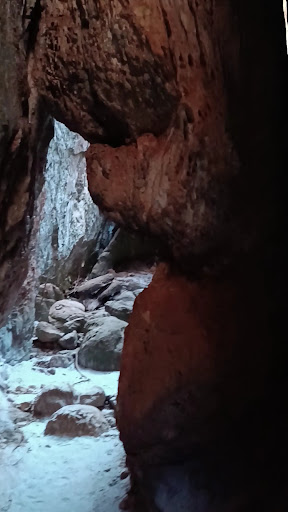 Esta é uma gruta de rocha quase inteiramente cercada com paredes verticais altas em comparação com o tamanho do piso, criando um espaço "escondido" intrigante.