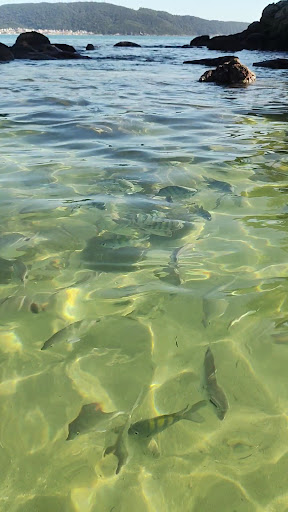 English: Prainha in Bombinhas is a small beach with a tiny stretch of sand, commonly used by locals for fishing due to its favorable conditions. However, the fishing activity does not disturb bathers, who can enjoy the beach as it has no waves. The water is crystal clear, allowing for the visibility of numerous fish swimming, making it an ideal spot for those seeking a calm and pleasant environment.