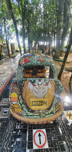 O local é bem peculiar, com várias obras de arte de mosaico integradas à natureza. Todas as obras são temáticas e contam com uma explicação do histórico de como foi feita. Uma das que mais chamam atenção com certeza é o fusca! A estrutura conta ainda com banheiros e também uma lojinha onde é possível comprar lembrancinhas e obras da artista que idealizou o parque.