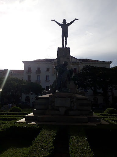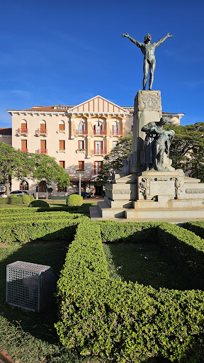 A imagem captura a essência da Praça Pedro Sanches em Poços de Caldas, com um foco particular na imponente estátua que se eleva sobre um pedestal elaborado. A figura masculina com os braços abertos, em um gesto de triunfo ou acolhimento, domina a cena e transmite uma sensação de grandiosidade. O cuidado com os detalhes é evidente no pedestal, adornado com outras esculturas e inscrições, que convidam à contemplação e à reflexão sobre seu significado. A praça em si é um espetáculo de jardinagem e urbanismo. Os arbustos podados em formas geométricas precisas criam um contraste harmonioso com a arquitetura do prédio ao fundo, que ostenta sacadas charmosas e telhados que remetem a um estilo clássico. A vegetação densa e bem cuidada, inclusive as árvores que fornecem sombra, contribuem para um ambiente fresco e convidativo. Embora o coreto não seja visível na imagem, a descrição sugere que a praça é um local de encontro e lazer, um verdadeiro oásis urbano. A combinação da arte escultural com a beleza natural e arquitetônica faz da Praça Pedro Sanches um ponto de referência e um cartão postal de Poços de Caldas, ideal para um passeio tranquilo ou para apreciar a...