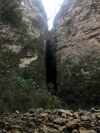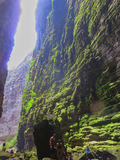 Read moreA cachoeira da fumacinha fica em Mucugê e o acesso mais comum é por Ibicoara, pelo povoado do Baixão. Estávamos na Toca do Vaqueiro, então, comecei a trilha por cima e descemos a fenda até a cachoeira e por fim, terminamos pelo percurso comum, indo até o povoado. A trilha comum tem em média 18km ida e volta e possui uma dificuldade moderada. Acredito que a fenda subindo ou descendo aumente o nível de risco tornando-a nível intermediário/difícil. Vai depender da dificuldade de cada um... É uma trilha longa, pelo leito do rio, onde existem caminhos pelas laterais da mata e outros que obrigatoriamente teremos que pular pedras. São trechos de lentidão, mais uma vez, dependendo do nível de cada um. Eu indico muitíssimo! É uma trilha linda, arborizada, úmida, com cenários que beiram o inacreditável. Chegando na cachoeira, além de ter uma formação curiosa, seu poço é um dos maiores e mais gelados da Chapada. Por estar alocada numa parte escura da fenda, acaba por não receber tanta radiação solar e por isso as pedras ao redor dela são repletas de musgos e uma água...
