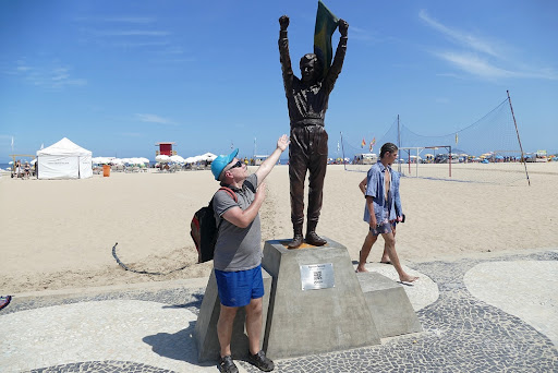 His statue on the sidewalk, is back to Copacabana Beach, facing the Copacabana Palace, reportedly the best hotel in town. It’s a live size, he stands on top of the podium that he had stood for more than 40 times in his short career. His left hand is holding a Brazilian flag.