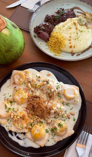 Read moreFui para conhecer o restaurante Guará Casa de Praia, e eu amei. O espaço é maravilhoso, super descontraído e organizado. É petfriendly de verdade, das mesas dá pra ver as pessoas jogando beach tenis, muito gostoso. A comida é igualmente linda e saborosa. Pedi o ravioli de banana da terra que era a opção vegetariana, e a fraldinha grelhada que me disseram que estava muito boa também. Infelizmente não encontrei opção vegana no cardápio, queria muito que incluíssem! É super importante e faz falta. A sobremesa é bem grande, dá pra dividir tranquilamente. Muito boa, só achei a calda um pouco doce demais. O atendimento é muito bom, e com...