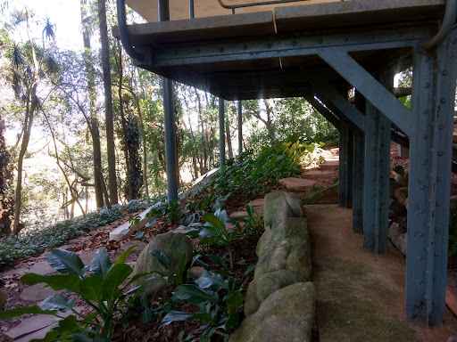 Um dos guias foi à frente e outro atrás, praticamente "pastorando" o grupo. A casa estava muito mal cuidada: havia um rodo jogado no lago, as paredes estavam com infiltrações e o cheiro de mofo era insuportável. Mudaram o layout da sala e empilharam os livros de Lina na lateral do ambiente. Estava tudo desorganizado e descuidado. Com certeza, Lina deve estar se revirando no túmulo! 50 reais para ver uma casa deteriorada, com paisagismo negligenciado, folhas secas espalhadas e a parte de trás da casa parecendo um lugar abandonado.