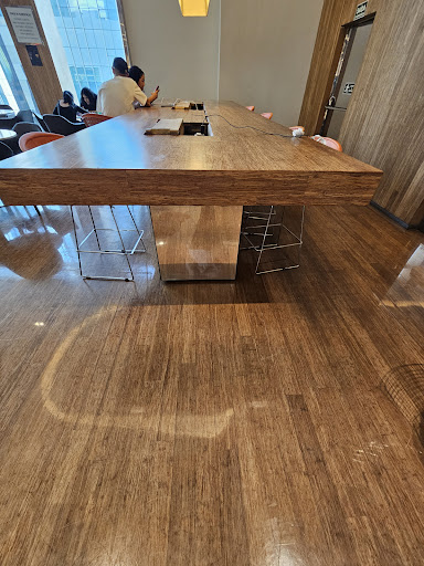 Food court and Cinepolis movie theater are on the top floor. Food court is extremely crowded and chaotic during lunchtime, so it's hard to find seating to eat. The food court has electrical charging outlets hidden in the top of the tall wooden work stations/tables (see photos...