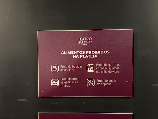 Read moreEstive no Teatro Liberdade hoje para assistir a peça Beetlejuice e no momento do intervalo, desci a lanchonete do estabelecimento e comprei um hambúrguer na própria lanchonete localizada dentro das dependências do teatro. No entanto, ao levar o lanche para a plateia, uma fiscal me informou que o consumo de hambúrguer não é permitido dentro da plateia, solicitando que eu me retirasse para comer em outro local.