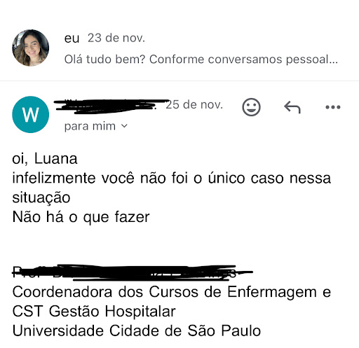 Um parenteses na história para dizer que já achamos muito estranho a nota da redação, que foi de 5.5. Meu irmão tirou foto dela para se resguardar e estranhando a nota, pedimos para ver a correção, para entender o que levou a essa nota, mas a universidade informou que eles não possuem esse documento e informações para nos passar. Muito estranho não? O que só me leva pensar que a famosa prova de desconto de até 50% é pura [Editado pelo Reclame Aqui]...