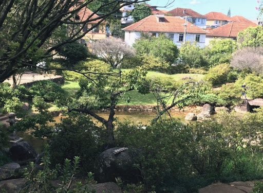 A praça foi criada por um mestre zen e tem um estilo clássico. Aquela concha de água serve para lavar as mãos em sinal de purificação antes da cerimônia do chá. Cada detalhe foi criado com um objetivo próprio que foge ao entendimento da pessoa ocidental comum que não conhece tradição japonesa. Além das árvores e dos arbustos, os jardins Japoneses usam artisticamente pedras, areia, colinas artificiais, lagoas e água corrente. Em contraste às árvores geometricamente arrumadas e às pedras de um jardim do estilo ocidental, o jardim Japonês cria tradicionalmente uma composição cênica que, da forma mais ingênua possível, imita a natureza. Os designers de jardins seguem três princípios básicos ao criarem os cenários. Eles são: escala reduzida, simbolização e “paisagens emprestadas”. O primeiro se refere à miniaturização de paisagens naturais de montanhas e rios para reuni-los em uma área limitada, o que pode significar a criação de cenários idealizados de uma vila nas montanhas ou até mesmo dentro uma cidade. A simbolização envolve abstração, como por exemplo, o uso de areia branca para criar o mar. As “paisagens emprestadas” dos designers surgem quando esses utilizam imagens de fundo que estavam de fora e além do jardim, como uma montanha ou oceano, transformando-as em parte da composição cênica. O quadro básico do jardim Japonês, de acordo com uma linha de pensamento, é fornecido pelas pedras e a forma em que são agrupadas. Os japoneses da antiguidade acreditavam que um local cercado por pedras era habitado por deuses, assim nomeando-o de amatsu iwasaka (barreira celestial) ou amatsu iwakura (assento celestial). Da mesma forma, um denso aglomerado de árvores era chamado de himorogi (cobertura divina); fossos e córregos, conhecidos por cercar solo sagrado, eram conhecidos como mizugaki (cercas de água). Os jardins Japoneses podem ser classificados em dois tipos mais gerais: o tsukiyama (jardim de colina), que é composto por colinas e lagos, ou hiraniwa (jardim plano), uma área plana sem lagos e colinas. Primeiramente, era comum utilizar o estilo colina para o jardim principal de uma mansão e o estilo plano para espaços limitados. Porém, o último, se tornou mais comum devido à cerimônia do chá e a chashitsu (sala da...