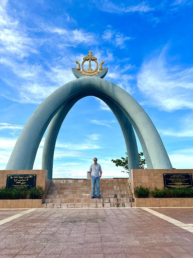 The monument is by the sea side and one can spot from there some of the off-shore oil platforms.