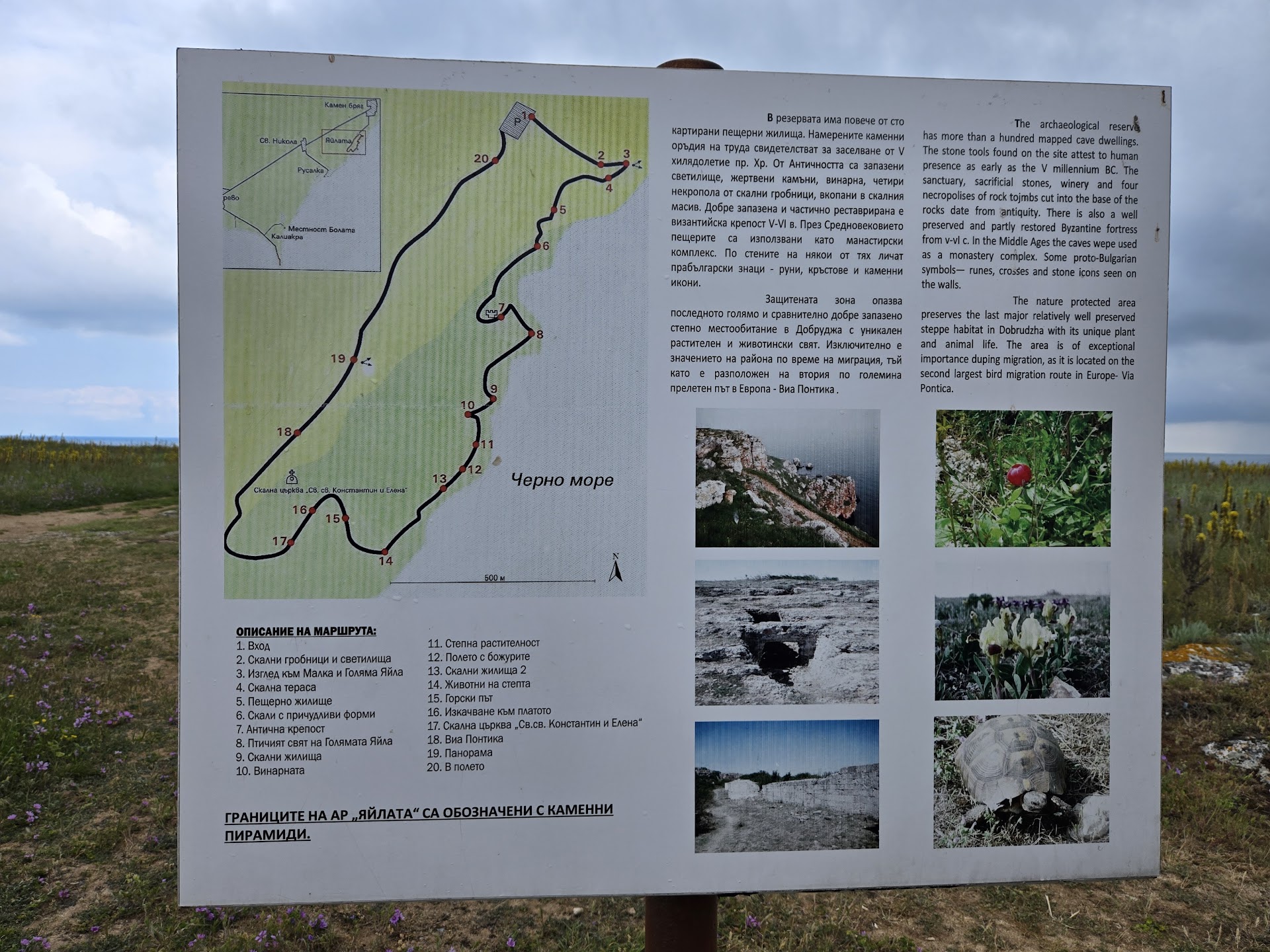 Read moreАрхеологическият резерват Яйлата" е уникално място, което съчетава крепостни риуни и девствена природа. Тук се намира пещерен град" от над 100 пещерни жилища. Намерените каменни оръдия на труда свидетелстват за заселване от V-то хилядолетие пр.н.е. От Античността са запазени светилище, жертвени камъни, винарни, четири некропола от скални гробници, вкопани в скалния масив. Добре запазена и частично реставрирана е византийска крепост V-VI в. от н.е. Част от стените й се издигат над земята. През Средновековието пещерите са използвани като манастирски комплекс. По стените на някои от тях личат прабългарски знаци - руни, кръстове и каменни икони. Живописната местност Яйлата представлява приморска тераса, ограничена от Добруджанското плато и морето. Тукашните степи и отвесни скалисти брегове са не по-малко впечатляващи от Калиакра. За опазването на тези места през 1987 г. е обявена защитена местност Яйлата" с площ 45.3 ха. Тук сред многобройните останки от древни цивилизации е царството на червения божур. Скалите се обитават от качулатия (аристотелев) корморан, бухала, синявицата, папуняка, каменарчета. Пасищата се огласят от песните на чучулигите (дебело клюна, късопръста, полска, качулата) и сивата овесарка, а там където преобладават храстите са характерни черноглавата овесарка, червеногърбата сврачка, малкия маслинов присмехулник и др. Районът на Яйлата има голяма значение за опазването на редкия за Европа степен пор, пъстър пор и добруджански хомяк.