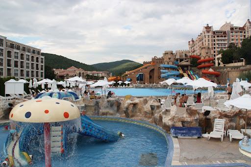 Неплохое место для поднятия настроения. Но не целыми днями, конечно, а в перерывах между походами на пляж. Всё-таки этот аквапарк - приложение к гостиничному комплексу, а не городской парк аттракционов, так что искать здесь чего-то экстраординарного не стоит. Ходить сюда за деньги (то ли 20, то ли 30 лев), стоит подумать.... Где-то на панно указано, что во второй половине дня дешевле. И это даже лучше - вода достаточно прогревается. А до обеда, действительно, прохладно. Особенно, если долго нежиться на солнце, а потом вдруг ломануться в воду. Но вода чистая. Лежаки и зонты бесплатные. Не мешает иметь с собой гвоздь или шпильку, чтобы фиксировать зонт в открытом состоянии - не все они исправны. Персонал не всегда достаточно внимателен, случаются и столкновения на горках,. Будьте бдительны сами в первую очередь. Наверху, в ожидании очереди на спуск, бывает что сквозит, мокрые металлические ступеньки - скользкие. Иногда приходится ждать "ватрушку" или "восьмерку" для скоростного спуска. Персонал не следит, чтобы съехавшие сразу отдавали инвентарь ожидающим, а не шли на повторный круг или передавали своим же компаньонам. В глубине парка - фитнесс-площадка с тренажерами, рассчитанными скорее на пенсионеров, для разминки суставов-сухожилий, но и там некоторые сидения...