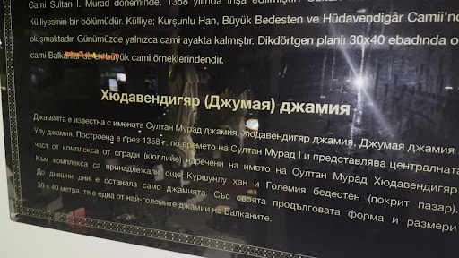 Hudavendigar (Dzhumaya) Mosque The mosque is known under the names Sultan Murad Mosque, Hudavendigar Mosque Cuma (Friday) Mosque and Ulu (Great) Mosque.It was built during the reign of Sultan l. Murad in 1358 and was part ofthe Sultan Murad Hudavendigar. Complex of buildings. fhe complex includec Kulliye: Kursunlu Khan, The Great Bedesten (Bazaar) and Hudavendigar Mosque. Today, only the mosque has remained. With its oblong shape and 30 x 40m size, it is one ofthe biggest mosques on the Balkans.