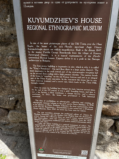 Read moreWe learned from our Lady Tour Guide that this Museum’s home was built for a Plovdiv Merchant, Argir Hristov Kuyumdzhioglu, thus its known as Kuyumdzhioglu House aka The Plovdiv Regional Ethnographic Museum!!! This house has a symmetric façade, it features a Plovdiv’s mid 19th century baroque architecture. During the tour, I lost count with their number of rooms on every floor, but lots of exhibits are on display from, agriculture, crafts, fabrics and costumes of the community, furnitures and interior, musical instruments, religious items and works of art exhibits. There is a library & archives of photos etc. It has a souvenir outlet where you will find a variety of handmade replicas of antique jewellery, various magnets , museum postcards, embroidery works. some of which you can take as a gift or a souvenir from your visit.