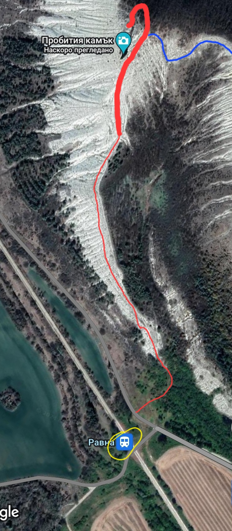 Ще кача снимки с маршрута: червената линия е маршрута, а там където е по-дебела линията е по-трудния участък. Синята линия е пътечка към други скали. Желателно е да оставите колите някъде около кръстовището с ЖП прелеза, понеже от там е най-лесен пътя нагоре/надолу. Пробвал съм и от другата страна на Побит Камък, но там изкачването е по-сериозно и...