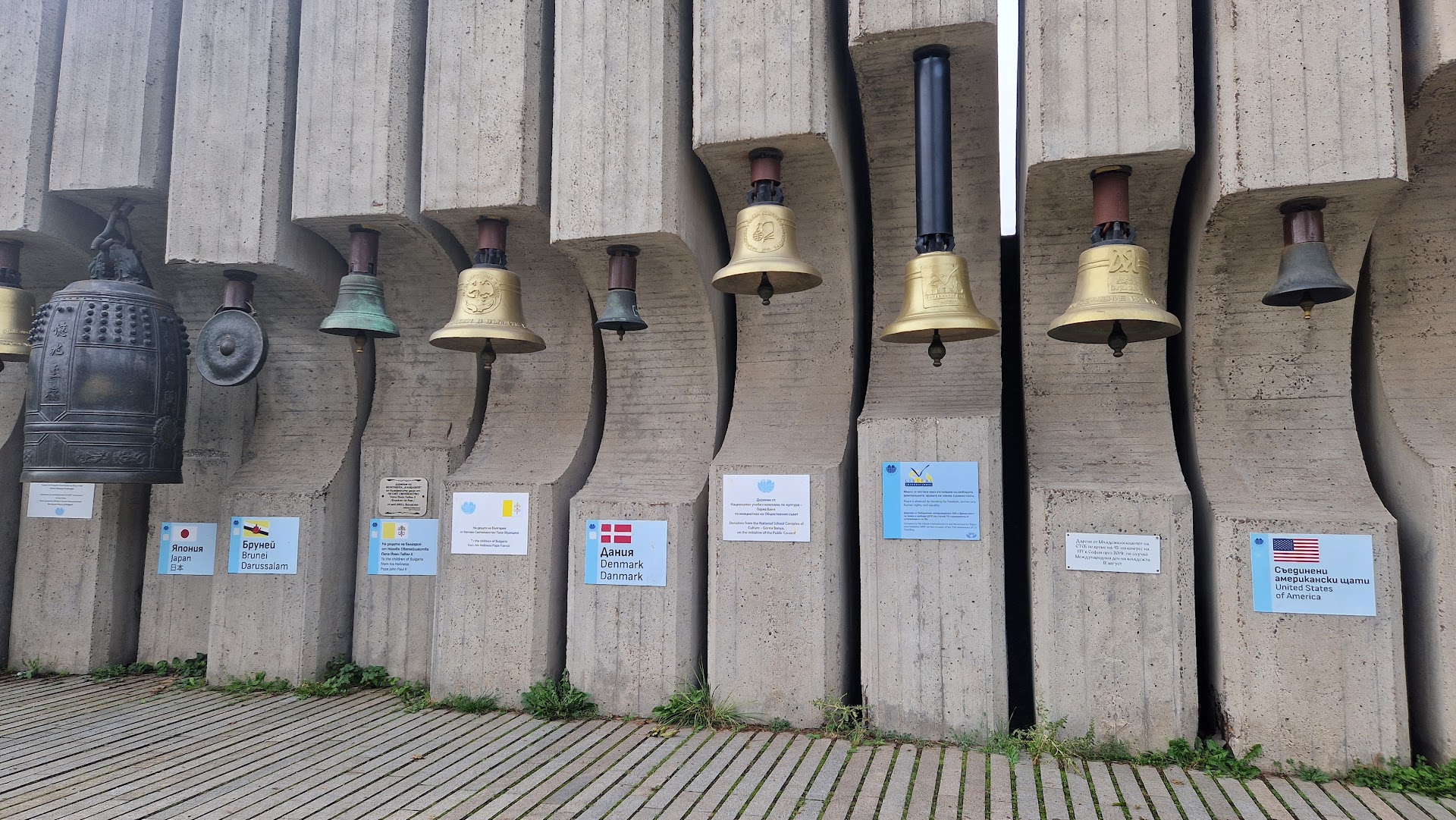 The "Bells" monument holds its name from the fact that the base of the monument has 2 rows of concern bell stands. The idea was, that each country, visiting Bulgaria brought a bell, whey they came to the assembly. There are several really old ones. And some are enormous. Also in the middle there is a place with 11 bells on the top of the structure, that can play a whole concert.