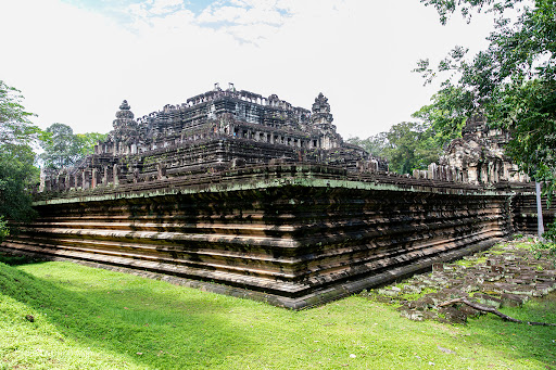 Read moreNorth of the Golden Tower [Bayon], rises the Tower of Branze [Baphuon] higher even than the Golden Tower : a truly astonishing spectacle, with more than ten chambers at its base. The grandeur of Baphuon as described above by Zhou Daguan is unrecognizable today because of the poor condition of the temple. The French were in the process of restoring this temple when they were forced leave Angkor in 1972 because of war. Baphuon is situated inside the royal city of Angkor Thom but dates from the eleventh century and was built before the city was established. An interesting feature of Baphuon are the bas-reliefs which are scenes carved in small squares. Unfortunately few of these are visible because of the poor state of the temple. The narrative themes are realistic depictions of daily life and forest scenes. LAYOUT Baphuon is a single sanctuary temple-mountain situated on a high base. It is a symbolical representation of Mount Meru. A rectangular sandstone wall measuring 425 by 125 metres (1394 by 410 feet) encloses the temple. A long sandstone elevated approach (200 metres, 656 feet) at the east entrance forms a bridge to the main temple. It is supported by three rows of short columns. The temple stands on a rectangular sandstone base with five levels that are approximately the same size, rather than the more common form of successively smaller levels. The first, second and third levels are surrounded by sandstone galleries. Baphuon is the first structure in which stone galleries with a central tower appear. Two libraries (6) in the shape of a cross with four porches stand in the courtyard. They were originally connected by an elevated walkway supported by columns. The gallery of the enclosure collapsed and, at a later date , the stones from it were modeled into the shape of a reclining Buddha that spans the length of the west wall ( the head is on the left, facing the temple) . It is an abstract form and the outline of this Buddha is difficult to distinguish. A stairway leading to the summit begins in the middle of the Buddha. The top level is in poor condition due to several collapses. Originally there was a Central Sanctuary with two wings. Each side of the entrance to the Central Sanctuary is carved with fine animated figures. If you look carefully you can see these from the ground on...
