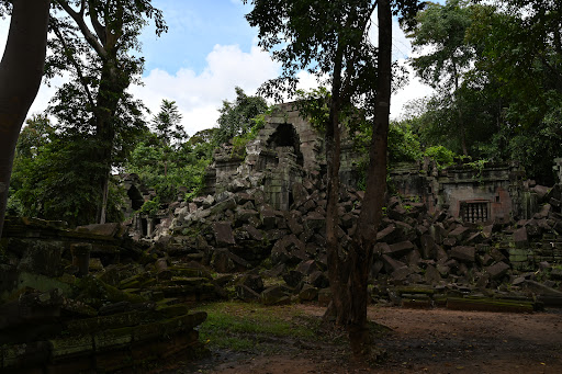 Beng Mealea (its name means "lotus pond") is a temple in the Angkor Wat style located 40 km east of the main group of temples at Angkor, Cambodia. It was built as hinduist temple, but there are some carvings depicting buddhist motifs. Its primary material is sandstone and it is largely unrestored, with trees and thick brush thriving amidst its towers and courtyards and many of its stones lying in great heaps.
