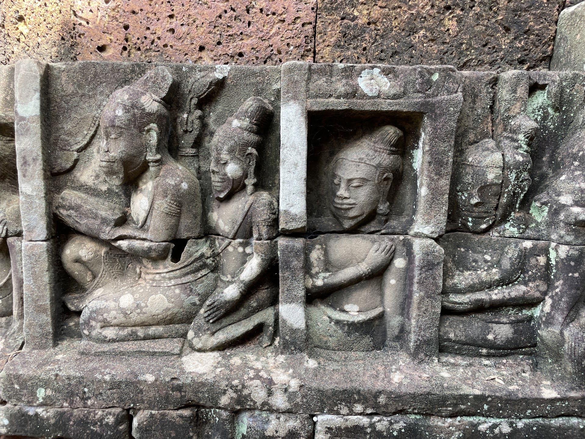 The Terrace of the Leper King has carvings of nagas (dragons), demons and various mythical beings. The inner wall was built first, and the outer wall was added later covering the inner wall. Archaeologists excavated the inner wall in the late 1990s.