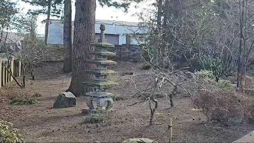 There are nice little seating areas tucked away behind all-season vegetation like a bamboo forest, flowering bushes and cherry trees. The mini waterfall, streams and pond are attractive and lay down some nice white noise to help keep traffic sounds at bay.