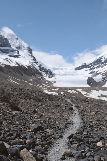 Across the glacier on the other side of the Icefields Parkway is what appears to be an Inn with...