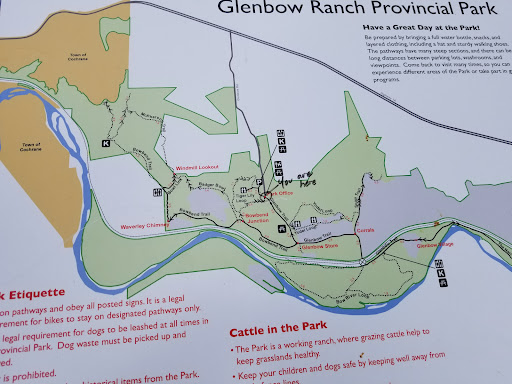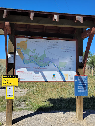 This is a provincial park available for day use just outside of Cochrane on the 1A highway. The turnoff to the park is gravel, but the distance is only a few kilometers to the park, of which the road inside the park is paved. There are washrooms available for use, picnic tables near the entrance. There is a paved bike path (bikes are only allowed on the paved path) and dirt trails available for hiking. You are allowed to bring dogs, but the dogs must remain on a leash, otherwise there is a fine. There are some trees areas, but the majority of the bike path is open and exposed with little shade cover. I would suggest bringing water as it can be quite dry and humid. The trails are shorter in nature with the longest taking only a couple hours (depends on how fast you walk). There are garbage bins strategically placed along the paths. There is a river that runs through the park, but no real areas to easily get to the river. Mostly cyclists and hikers at this park. The park is day use only, with no camping and...