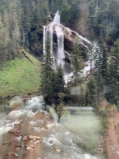 We witnessed the Pyramid Creek Falls from the train window while passing in VIA Rail's 'The Canadian' from Vancouver to Jasper in July 2019. It is located between the towns of Blue River and Valemount in British Columbia. One of the train crew announced when we would be passing it and I was lucky enough to be on the same side as the falls and got a good picture...